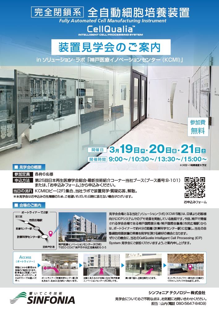この度、「第25回日本再生医療学会総会/JSRM-ISCT Joint International Conference on iPSCs 2026」の最新技術紹介コーナーに出展し、完全閉鎖系 全自動細胞培養装置 CellQualia™ Intelligent Cell Processing System のご紹介をさせて頂きます。